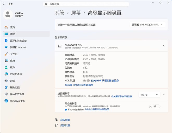 七彩虹将星X16 Pro笔记本搭载的16寸屏幕,分辨率为2560x1600,屏幕比例16:10,刷新率高达180Hz,可覆盖完整sRGB色彩空间。