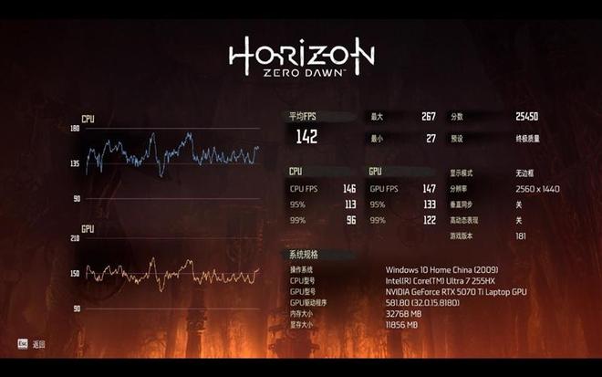 在《地平线:零之曙光》中,使用2K分辨率和终极质量画质测试,最终测试成绩为142fps。