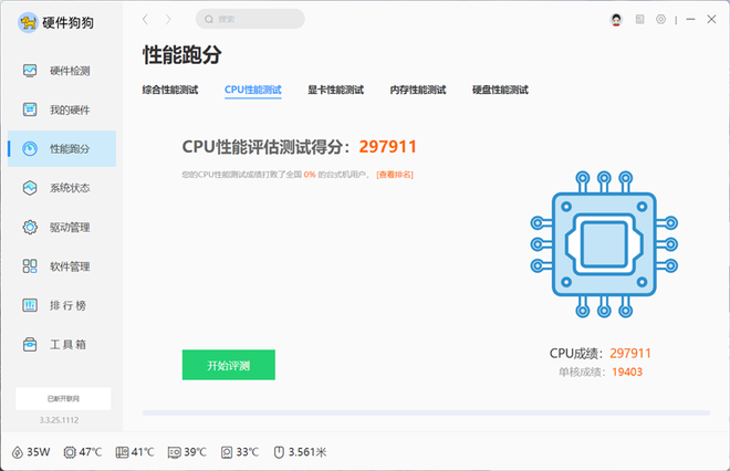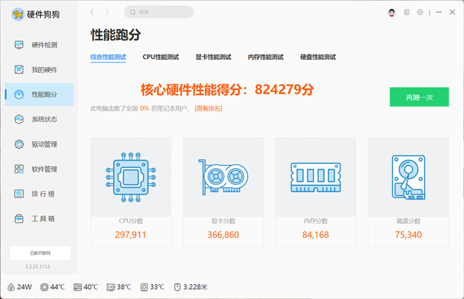 在硬件狗狗测试中,核心硬件得分为824279,CPU分数为297911。
