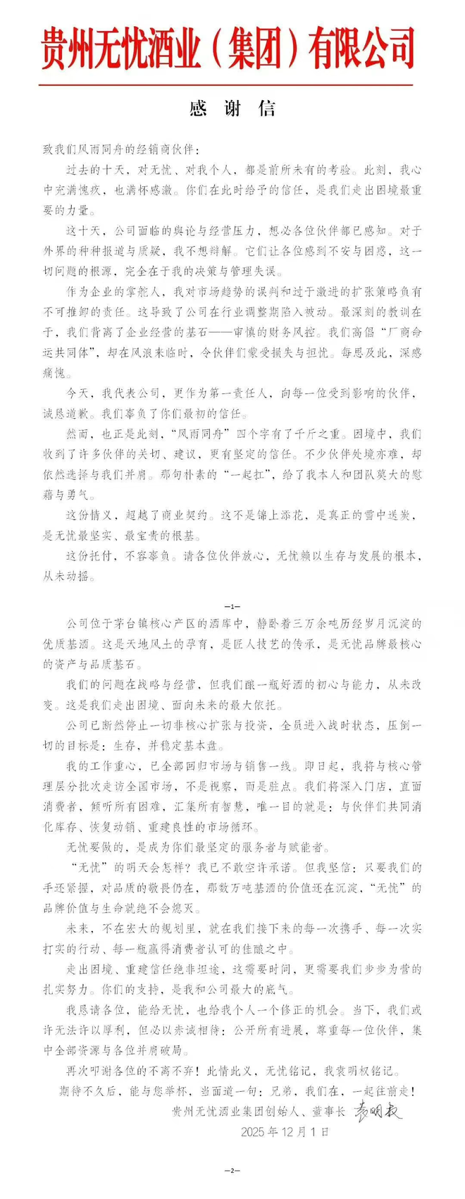 12月2日,一封落款“贵州无忧酒业(集团)有限公司创始人、董事长袁明权”的感谢信在白酒圈内流传。起因是近日一则贵州无忧酒业被列为被执行人的消息。