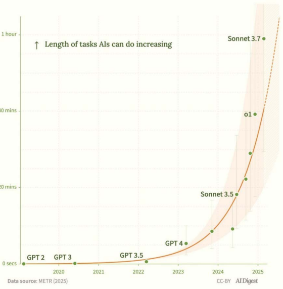 按照这个趋势推断,不到五年,AI智能体就能独立完成目前需要人类花费数天甚至数周才能完成的大部分软件任务。