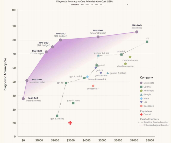 为了佐证这一观点,报告还列举了微软的医学AI案例:其AI诊断系统(MAI-DxO)在诊断《新英格兰医学杂志》真实病例时的正确率高达85%,是经验丰富的医生群体的四倍以上