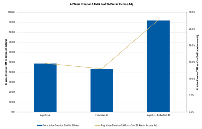 报告指出,对于标普500公司而言,AI技术有望在长期内创造约9200亿美元的收益,并可能释放出13至16万亿美元的市值增长空间。这一机遇的规模相当于标普500公司2026年预测调整后税前总收入的25%以上。