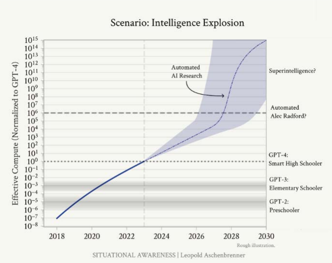 另一位思想家Leo Aschenbrenner在其论文《Situational Awareness》中也提供了大量证据,他预测,未来四年内,我们将见证又一次从GPT-2到GPT-4量级的质的飞跃。