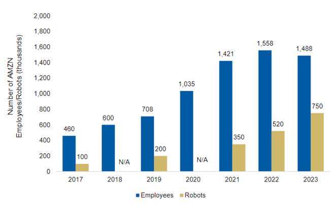 此外,具身智能对就业的冲击也不容忽视。以亚马逊为例,其仓库机器人数量从2017年的10万台激增至2023年的75万台,同期员工与机器人的比例从约4.5:1下降至约2:1。
