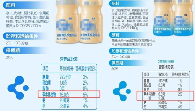 记者对比市售多款乳酸菌饮品成分表发现,部分乳酸菌饮料的含糖量较高,例如某些产品每100ml的碳水化合物含量可达15克以上;对比之下,同系列减糖版的乳酸菌饮料,每100ml的碳水化合物含量为6.8克。