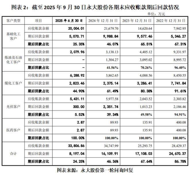 在第一轮问询回复文件中,永大股份表示,公司下游客户主要为基础化工、炼油及石油化工、煤化工与光伏领域的大型企业集团,行业地位突出,处于强势地位,下游客户基于项目执行进度安排资金结算,且结算审批周期较长,进而导致款项回款较慢、应收账款出现一定逾期的情形。