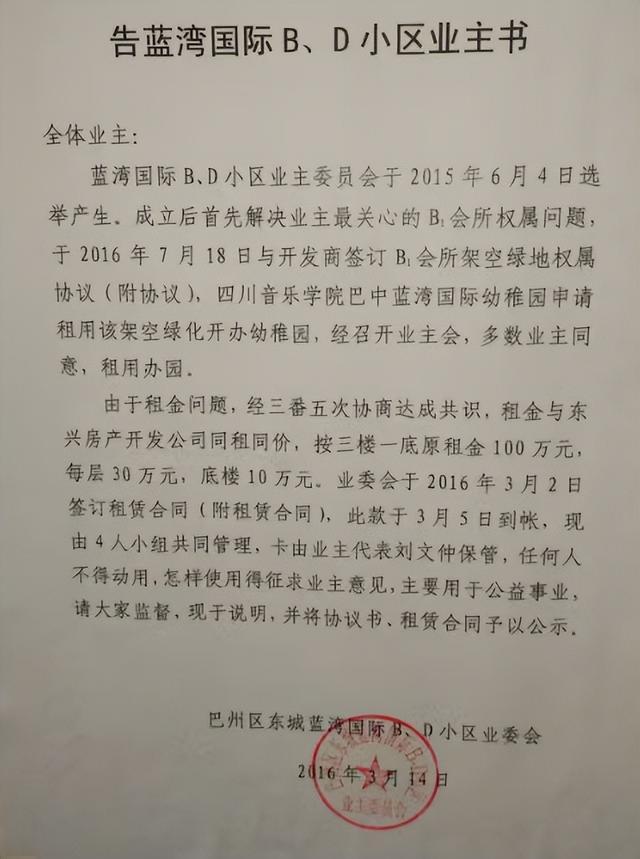 2016年3月14日,第一届业委会的一份《告小区业主书》介绍称,业委会成立后首先解决业主最关心的B1会所权属问题,于同年7月18日与开发商签订该会所架空绿地权属协议,四川音乐学院巴中蓝湾国际幼稚园申请租用该架空绿化开办幼稚园,经召开业主会,多数业主同意租用办园。
