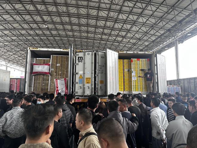 12月12日清晨,新一批海运智利车厘子刚靠泊广州南沙港,很快整船货物就被转运至广州江南果蔬批发市场。上午九点半,满载车厘子的货车刚停稳,工作人员抛下一箱样品,等候多时的果商便立刻围拢验货,叉车频繁往返将集装箱内的货柜运至地面。