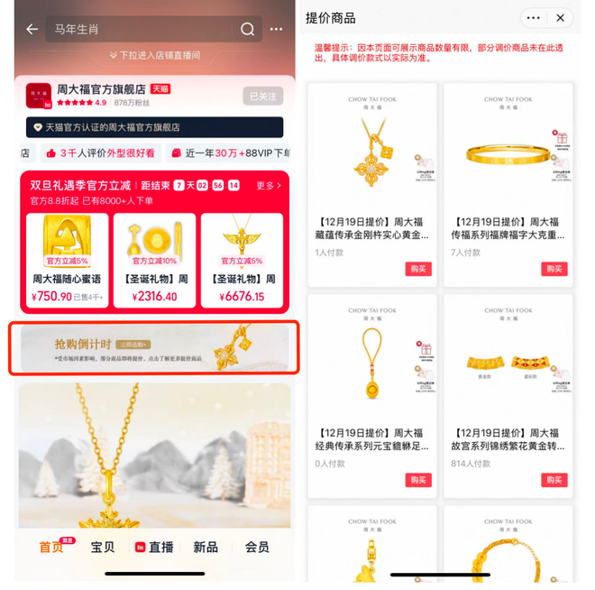 近日,周大福(01929.HK)通过天猫官方旗舰店发布提示:受市场因素影响,部分商品即将提价,调价窗口为12月19日。