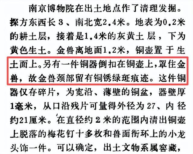 根据《文物》期刊1982年第11期,南京博物院原院长姚迁在《江苏盱眙南窑庄楚汉文物窖藏》一文中提及,出土时,金兽盖在铜壶上,金币贮于铜壶内,取下金兽时,有几块马蹄金还嵌在金兽底部的凹陷处,壶内有少量水汽,没有泥土和积水。金兽离地面1.2米,铜壶置于生土面上。另有一件铜器倒扣在铜壶上,罩住金兽,故金兽颈部留有铜锈绿斑痕迹。