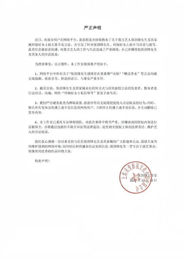 此前,12月12日,演员保剑锋工作室发布严正声明: