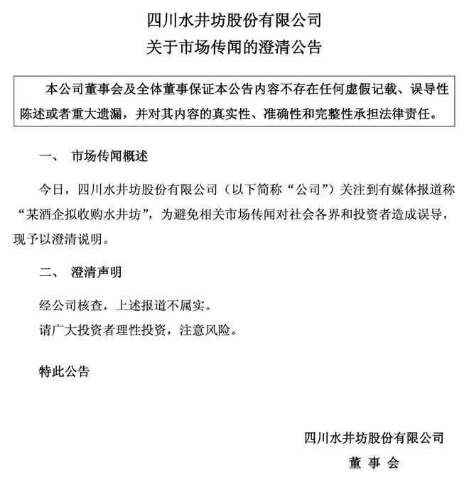 12月25日深夜,水井坊(600779.SH)发布公告火速澄清,明确否认“某酒企拟收购水井坊”的市场消息。