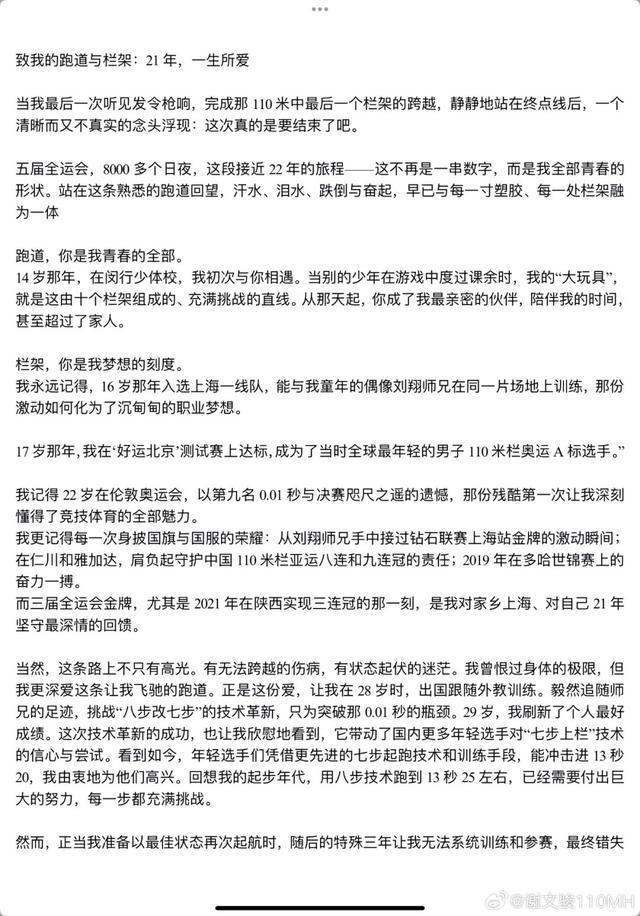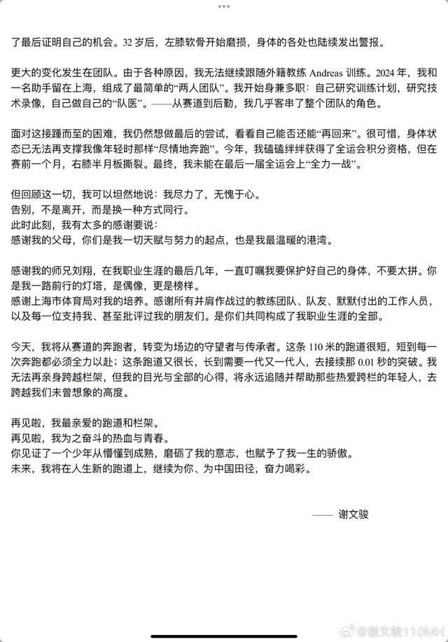 “今天,我将从赛道的奔跑者,转变为场边的守望者与传承者。这条110米的跑道很短,短到每一次奔跑都必须全力以赴:这条跑道又很长,长到需要一代又一代人,去接续那0.01秒的突破。”