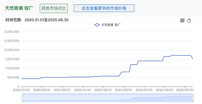而与此同时,片仔癀产品的主要原料天然牛黄价格仍在持续上涨。据中药材天地网数据,安国药市天然牛黄价格在2025年上半年已涨到170万元/公斤,亳州药市天然牛黄价格也涨至160万元/公斤。而6年前的2019年,其价格仅有35万元/公斤。