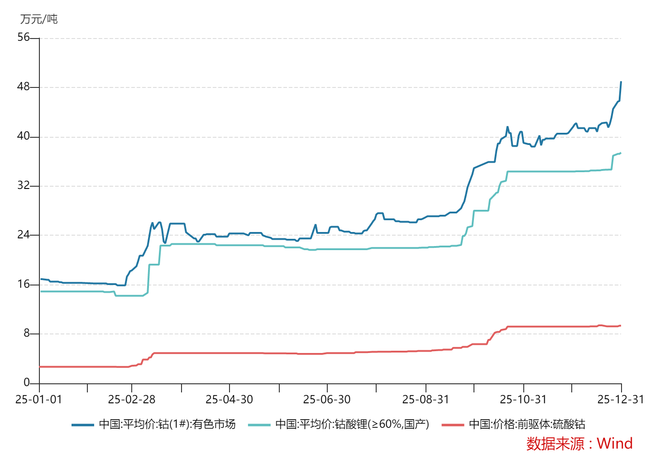 Wind数据显示,2025年12月31日,中国钴平均价达49万元/吨,较前一个交易日进一步上涨,并创下2022年下半年以来的新高。2025年以来,钴价涨幅已经达到190%。
