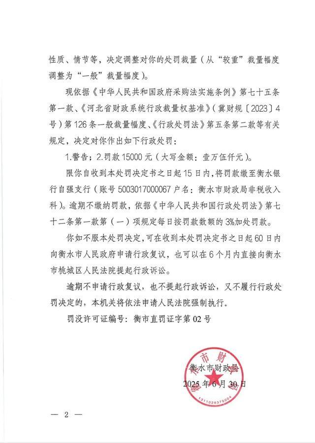衡水市财政局依据《中华人民共和国政府采购法实施条例》第七十五条第一款、《河北省财政系统行政裁量权基准》(冀财规〔2023〕4号)第126条一般裁量幅度、《中华人民共和国行政处罚法》第五条第二款等有关规定,决定对6名当事人作出如下行政处罚:1.警告;2.罚款15000元。