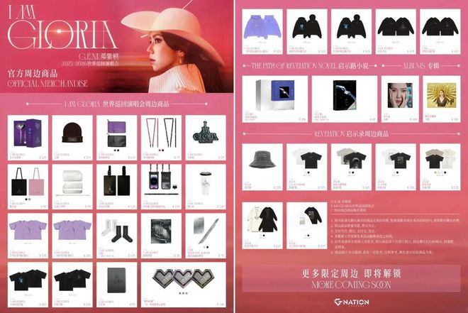 而在广州奥体,邓紫棋官方快闪(2025年12月24日-2026年1月14日)则把优托邦打造成一个巨大的“痛楼”,整个商场被偶像相关的元素铺满,吸引了大量粉丝。快闪店内售卖的周边品类覆盖官方应援棒、收纳包、毛帽、冰箱贴、T恤、卫衣、专辑等,价格在59-519元不等,掀起一轮又一轮的扫货热潮。