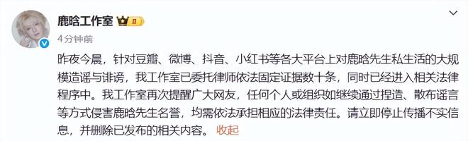 1月3日早晨,男星鹿晗工作室发文:昨夜今晨,针对豆瓣、微博、抖音、小红书等各大平台上对鹿晗先生私生活的大规模造谣与诽谤,我工作室已委托律师依法固定证据数十条,同时已经进入相关法律程序中。我工作室再次提醒广大网友,任何个人或组织如继续通过捏造、散布谣言等方式侵害鹿晗先生名誉,均需依法承担相应的法律责任。请立即停止传播不实信息,并删除已发布的相关内容。