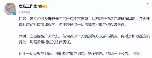 3日早些时候,鹿晗工作室发文辟谣:目前,各平台涉及鹿晗先生的所有不实信息,我方均已依法完成证据固定,并委托律师启动相应法律程序,将坚决通过一切法律途径追究侵权者责任。