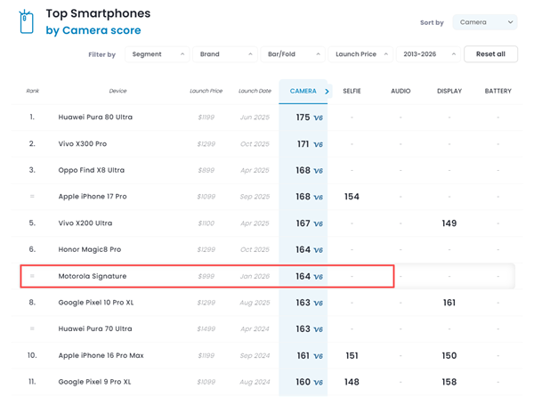 该机的海外版本moto Signature已经在CES上提前发布,并且DXO已公布评测成绩,综合得分达到了164分,与荣耀Magic8 Pro并列全球前六。