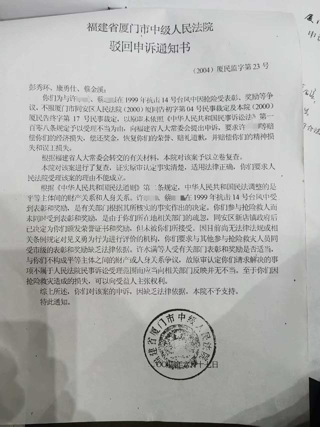 一审二审法院及高院均认为该诉讼不属于法院受理范围,诉讼请求被驳回。一份福建省厦门市中院驳回申诉通知书显示,根据《中华人民共和国民法通则》规定,中华人民共和国民法调整的是平等主体间的财产关系和人身关系。许某某、蔡某某在1999年抗击14号台风中受到表彰和奖励,是有关部门根据其所核实的事实作出的决定。你们参与抢险救人而未同时受到表彰和奖励,是由于你们所在地相关部门的疏忽,同安区新店镇政府后已决定为你们颁发荣誉证书和奖励,但未被你们所接受。