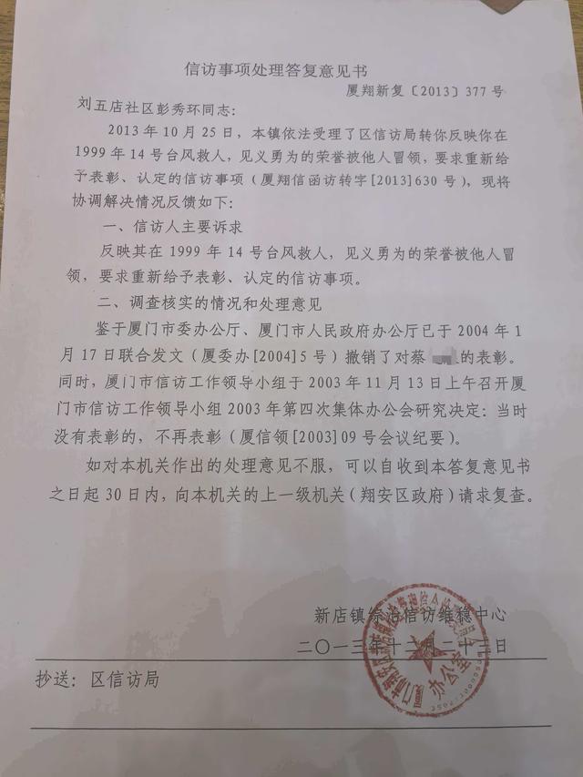 蔡先生介绍,在母亲多年的正名维权过程中,当地官方曾在回复中表示,厦门市委办公厅、厦门市人民政府办公厅已经于2004年1月17日联合发文,撤销了对蔡某某的表彰。厦门市信访工作领导小组也于2003年研究决定,当时没有表彰的不再表彰。