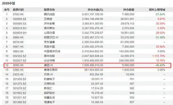 以易方达蓝筹为例,美团曾在多个季度出现在重仓股名单中。甚至包括2025年1季报。但在2季报,美团退出了重仓股名单。