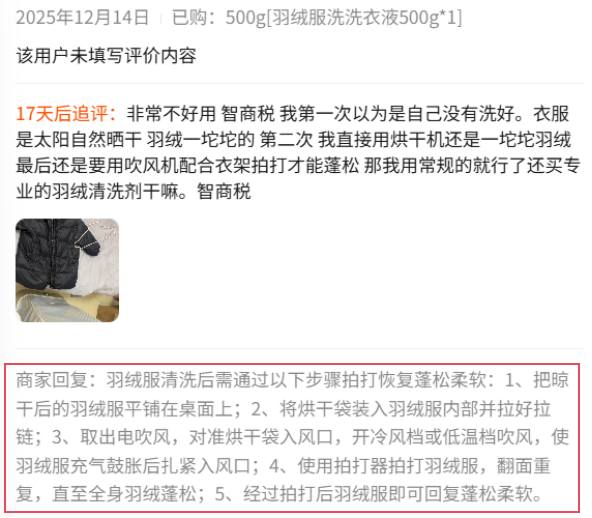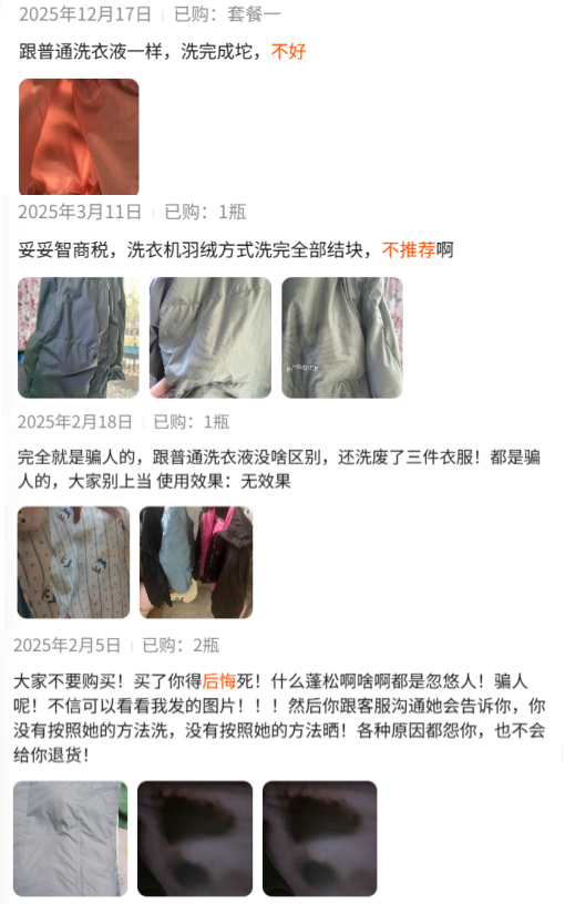 ▲部分消费者评论(图源:某羽绒服专用洗涤剂评论区)