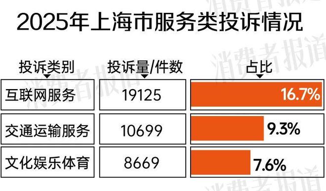 而在服务类投诉中,互联网服务、交通运输服务、文化娱乐体育的投诉最多,居服务类投诉的前3位,投诉量分别为19125件、10699件和8669件。
