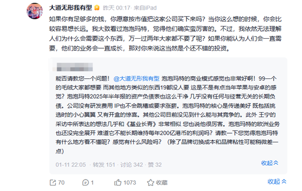他表示,虽然看不懂这家公司,不会去买他们的股票,但"高度认可它把情绪价值产品做成这样的能力,不是随便的成功,也不能归为运气"。