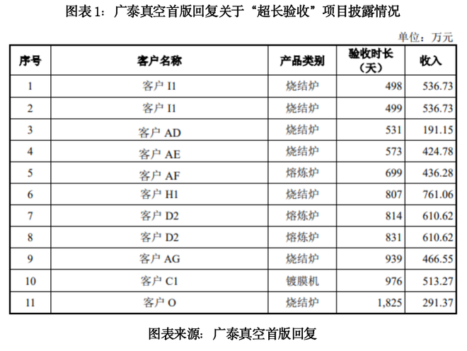 广泰真空表示,上述项目主要受客户的验收习惯、施工进度、产线建设进度、安装调试进度、客户发货后提出技术改造以及少数的产品质量争议等情况影响,使得其产品验收周期较平均验收周期更长。