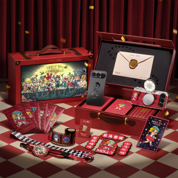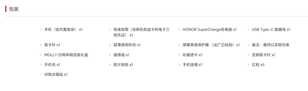 荣耀商城显示,限定版礼盒内包含定制取卡针、红包、彩窗透卡、邀请函、胶片贴纸、对联冰箱贴、手机壳等多款MOLLY主题周边配件。