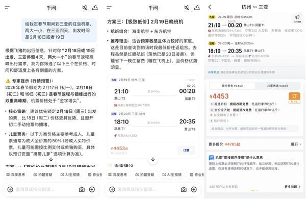 在春节出游场景中,千问App可以调用飞猪能力完成机票酒店的预定,可以调用高德的能力完成行程规划、年夜饭的预定。