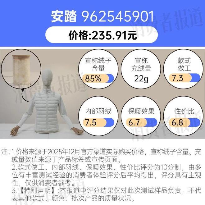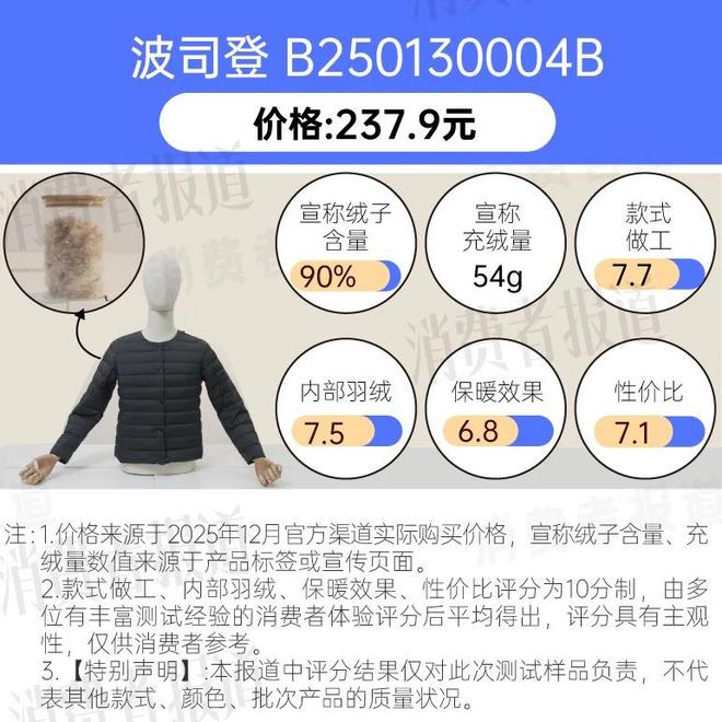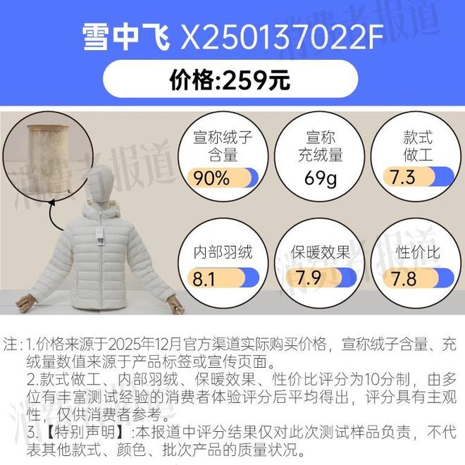 值得一提的是,羽绒的飘飞状况跟羽绒的蓬松程度、大小形态、位置分布等多种因素有关,因此此次试验并不代表各羽绒服的质量状况,仅供消费者参考。