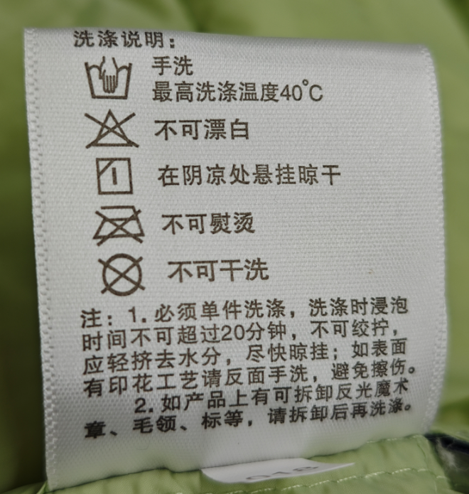 (3)按照标签说明进行洗涤护理。羽绒服被不宜过多洗涤,会降低羽绒的蓬松度,进而降低保温效果。日常清洁时,可用擦拭代替清洗。如确有需要,应按产品明示的方式进行洗涤,使用专用或中性洗涤剂,轻柔擦洗,不建议拧干或甩干,应轻挤去除水分,平铺或悬挂晾干后轻轻拍打,使羽绒服恢复蓬松柔软。