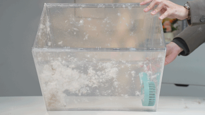 为了可以直观地观察羽绒服内部填充羽绒的轻盈程度,我们设计了一个小实验室:拆出9款羽绒服的内部羽绒,分别用电子秤称量1克,置于测试箱中,每次均用小风扇固定的档位吹动,查看羽绒飘飞状况。