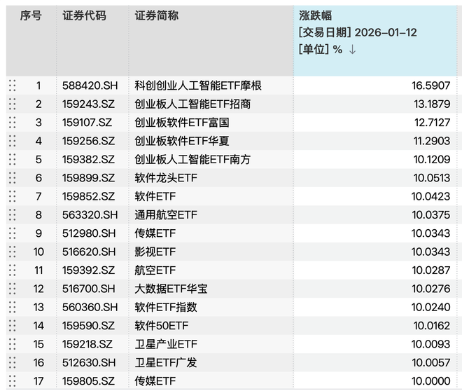 值得一提的是,1月12日市场中多只热门主题ETF迎来爆发,摩根科创创业人工智能ETF单日涨超16.59%,创业板多只软件或人工智能主题ETF单日涨幅超11%。此外,多只在主板上市的传媒、卫星、软件等主题ETF收盘涨停,成为当日资本市场的一大亮点。