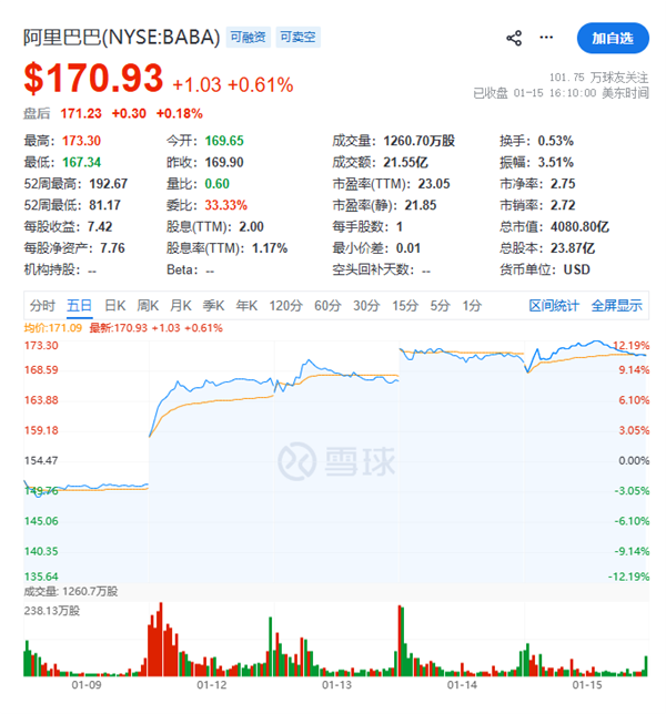 品途网1月16日消息,今日,阿里巴巴美股收盘价站上170美元。