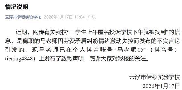 广东云浮学生匿名投诉学校下午被发现,校方通报是离职老师发布不实言论,涉事者已道歉。