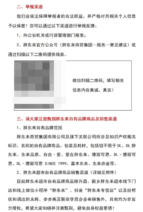 目前胖东来超市自有品牌商品除许昌、新乡胖东来超市线下门店和线上微信小程序"胖东来"、抖音"胖东来专营店"以及经帮扶和调改的永辉、步步高及联商学员企业有销售外,其他均为非官方授权,希望大家知晓并注意甄别,避免自身权益受损。
