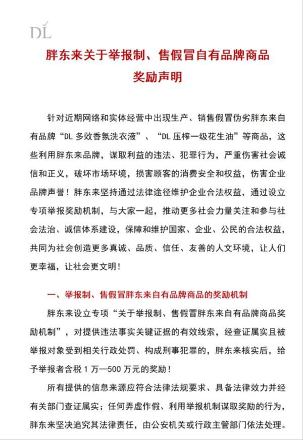 其中提到,针对近期网络和实体经营中出现生产、销售假冒伪劣胖东来自有品牌"DL多效香氛洗衣液"、"DL压榨一级花生油"等商品,这些利用胖东来品牌,谋取利益的违法、犯罪行为,严重伤害社会诚信和正义,破坏市场环境,损害顾客的消费安全和权益,伤害企业品牌声誉。