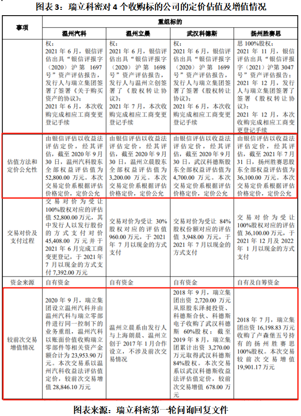 瑞立科密在第一轮问询回复文件中称,本次重组中,公司收购的4家标的公司股权较前次交易价格及净资产账面价值存在增值主要系因交易背景、交易时点、定价方式等存在差异所致。其中,瑞立科密称温州汽科的资产属于市场应用前景广、经营良好的盈利性资产,因此该公司于2021年以收益法评估值收购温州汽科,交易价格较其净资产账面值存在差异具备合理性。