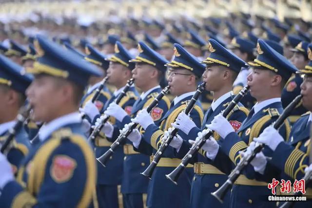 今早,军乐团在进行阅兵前的演练。