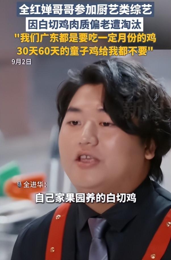 9月2日,据津云报道,全红婵哥哥全进华在参加厨艺综艺时,因选用自家养殖的180天走地鸡制作白切鸡,被评委指出“肉质偏老”而遗憾止步。