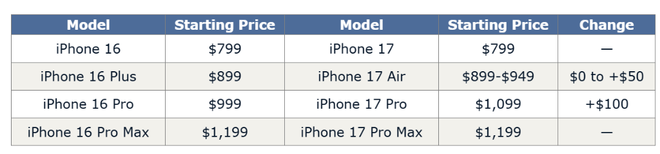 - iPhone 17 Pro 的起售价预计将从999美元上调至1,099美元。