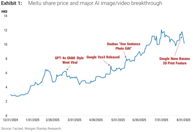 今年以来,每当有类似GPT-4o或谷歌Veo3等重量级AI模型发布更新时,美图的股价都曾出现过类似的波动。