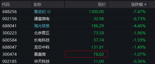 GPU概念股亦调整,寒武纪跌超7%,通富微电、海光信息等跌幅居前。
