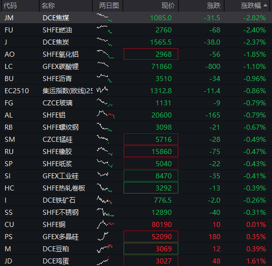商品:国内商品期货延续跌势,截至发稿,焦煤、焦炭、燃油跌超2%,其中焦煤跌近3%;氧化铝、沥青、集运指数跌超1%,铝、纸浆、玻璃、工业硅、螺纹钢、锰硅、碳酸锂、不锈钢、热卷板、铜等纷纷下跌,仅有鸡蛋、多晶硅、豆粕等少数品种走高。![]()