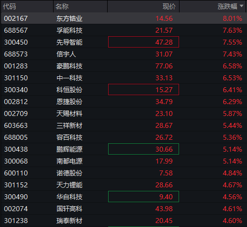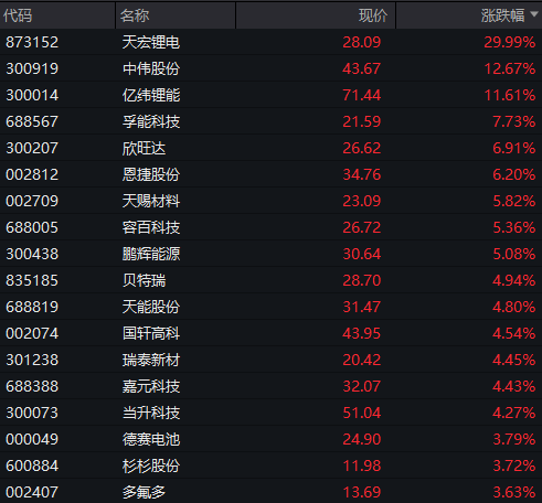 动力电池概念股集体大涨,天宏锂电30CM涨停,中卫股份、亿纬锂能、孚能科技等涨幅居前。